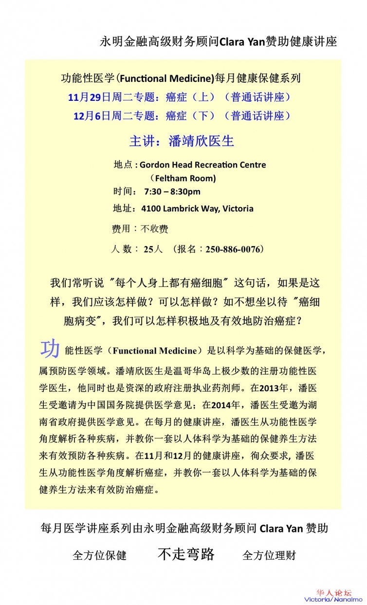 潘靖欣医生健康讲座主题癌症,分在11月29日(上)和12月6日(下)举行。有兴趣了解功能性医学如何防治癌症的朋友不要错过。在这两次讲座我也会简短介绍重大病保险是如何操作和理赔资料包括除外条款等。