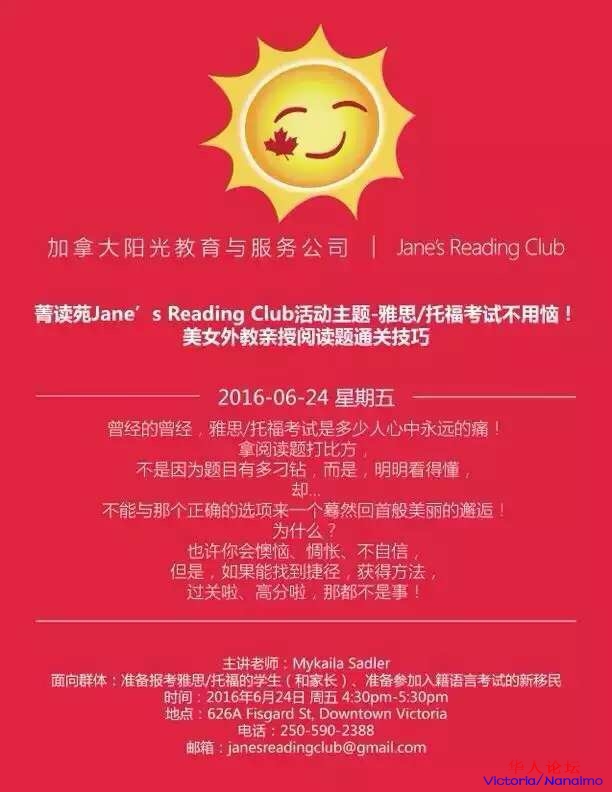 日(本周五)下午举办第五期读者见面会。这一期将为本地华人社区带来一场关于雅思托福阅读题通关技巧的讲解公开课,由Sunny Education