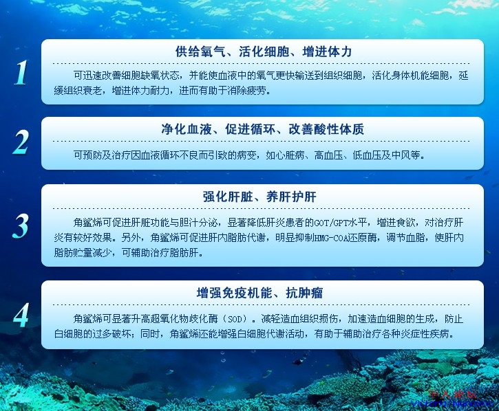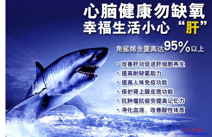 深海鲨鱼作为一种史前生物,在其肝脏富含高浓度的角鲨烯,这种物质是再其他任何鱼油内所找不到的。靠海吃海的人民祖祖辈辈收益于这种海下1000米的神奇生物,而健康长寿。日本是世界上平均寿命最长的国家,而鲨鱼是其主要食品之一。在日本,鲨鱼肝油被视为万能神药,被用于各种病症的辅助治疗。