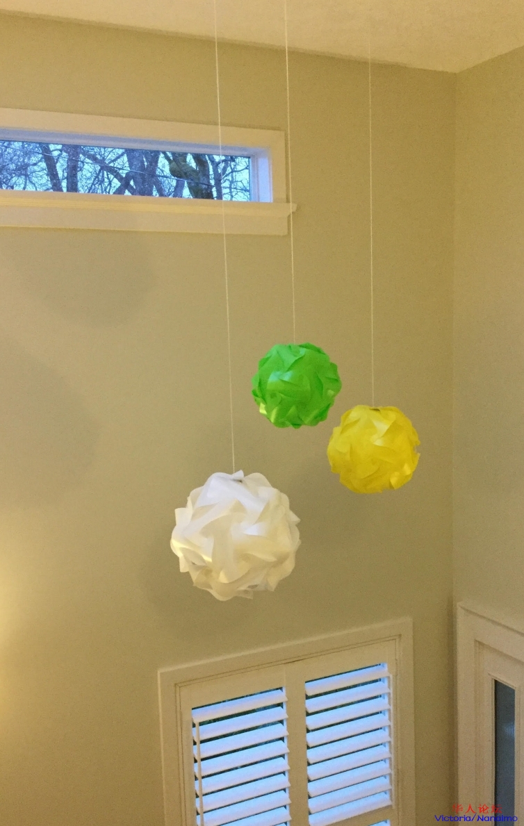 注:在Amazon网上买的(中国制造),30张片儿一个球自己组装,也可以当灯罩用。 祝心情顺,节日好,今天不用做饭。