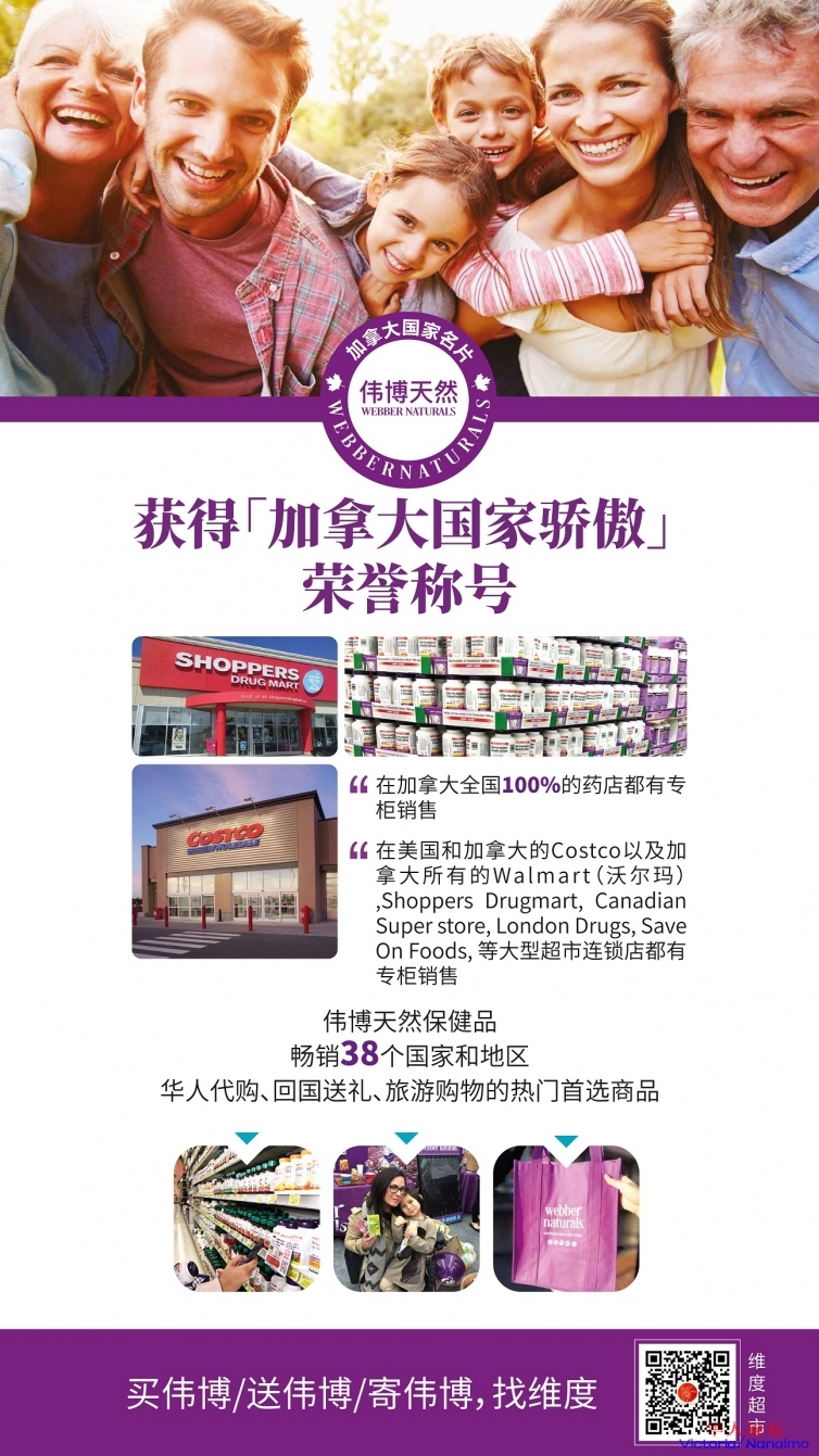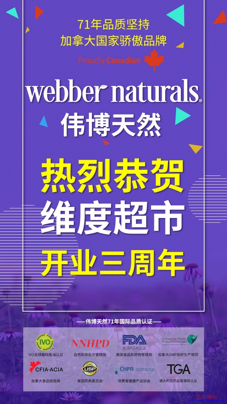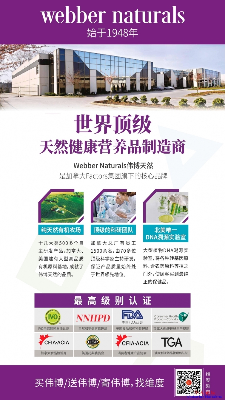 * i0 Y7 F, [& w- u7 z" p6 I6 p三周年临近,加拿大第一保健品品牌,Webber Naturals伟博天然团队,维度的战略合作伙伴,也将带着伟博全系列产品来到维度超市,同时最重要的是,这次活动,将以史上最大优惠力度,把最好的产品推荐给大家。但是时间只有两天,记住只要两天。